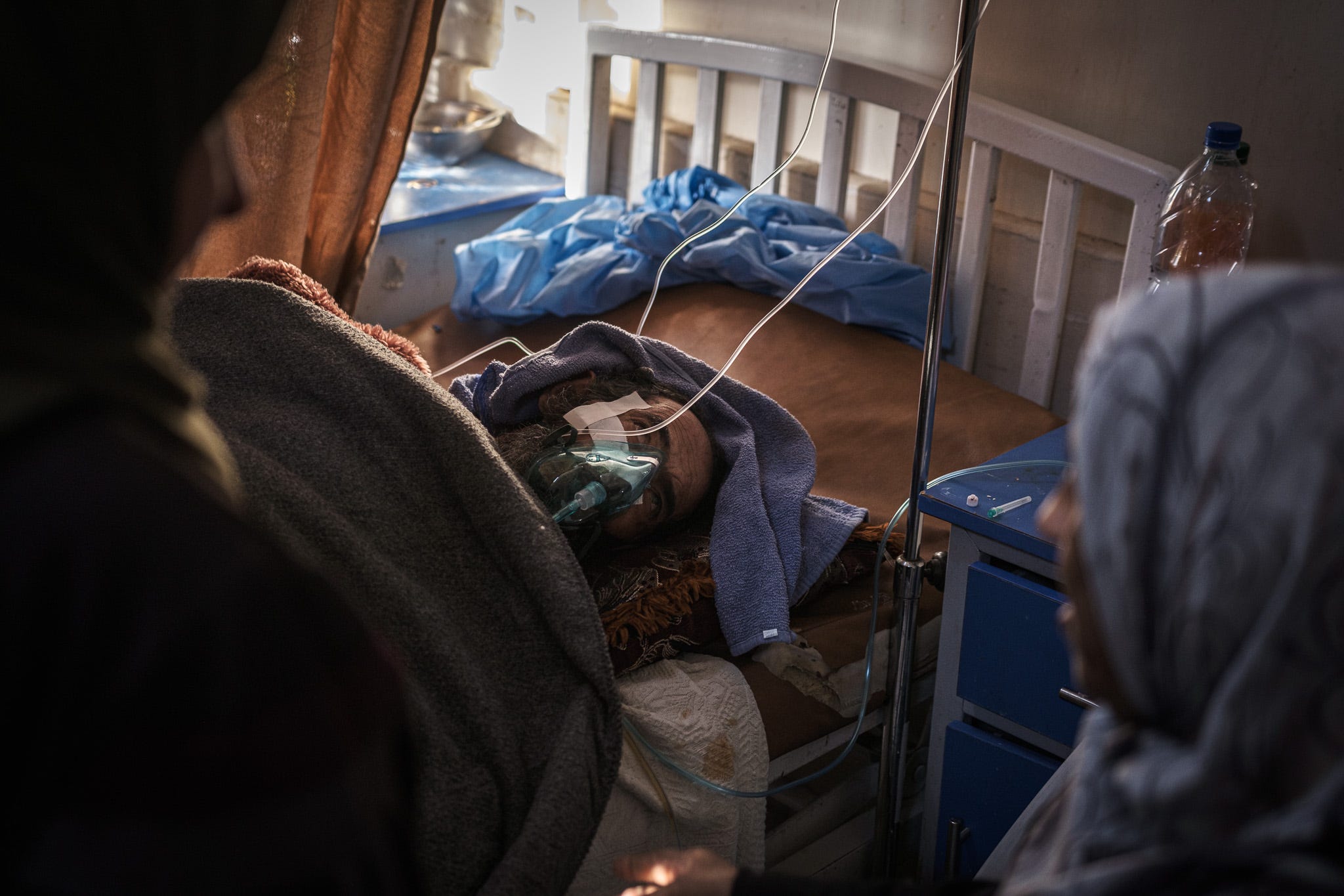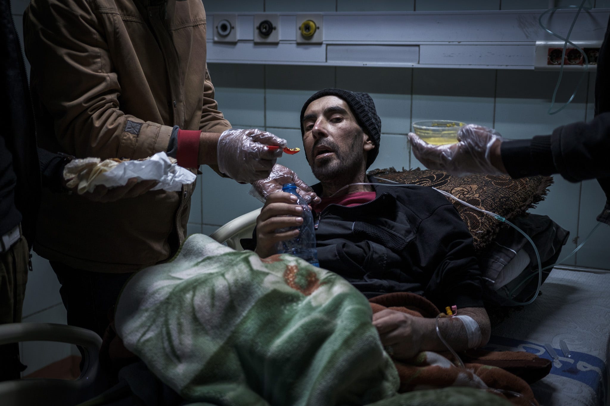 Unconscious for most of the day and unable to speak or comprehend his surroundings, Nour’s cognitive capabilities had been severely degraded through years of systematic physical and psychological torture. Doctors diagnosed him with tuberculosis, a bacterial disease of the lungs with a 70 percent fatality rate if untreated; he had also suffered a head injury, but the hospital’s magnetic resonance imaging test machine was broken, preventing the doctors from properly examining him. (It’s also unclear if his body, in its weakened state, could have endured an intensive examination.) Despite the risk of catching tuberculosis, his family sat beside him, wearing protective gear.