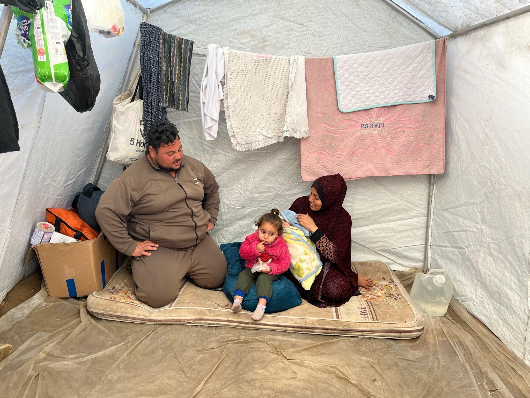 Sabreen Saleh, 32, has taken shelter in a leaky tent in Deir al-Balah with her husband and her two children, one of whom is a breastfeeding infant, after being displaced from Jabalya in northern Gaza. She has been very concerned about her baby’s health.