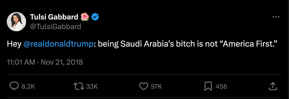 Tulsi Gabbard has been giving us whiplash for years via her contradictory statements and positions. I quit listening to anything she says.