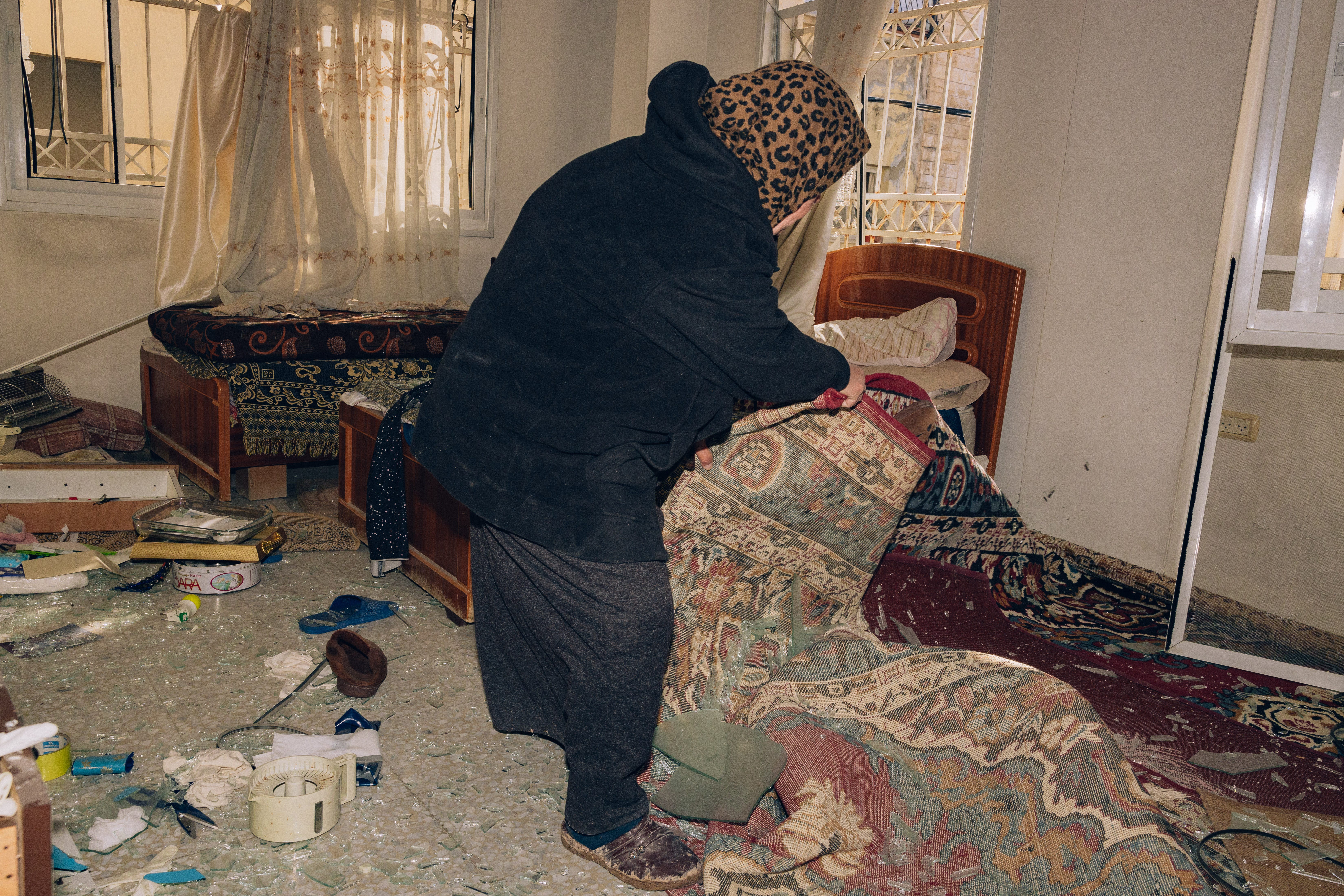 The moment Kareemeh walked into what remained of her home in the eastern part of the camp, she stood petrified. The windows had all been shattered—likely due to the airstrikes and demolitions, which left nearby buildings completely destroyed—and glass was all over the floor. The furniture was ransacked, the kitchen wrecked, and clothes had been pulled from the closet and tossed across the floor.