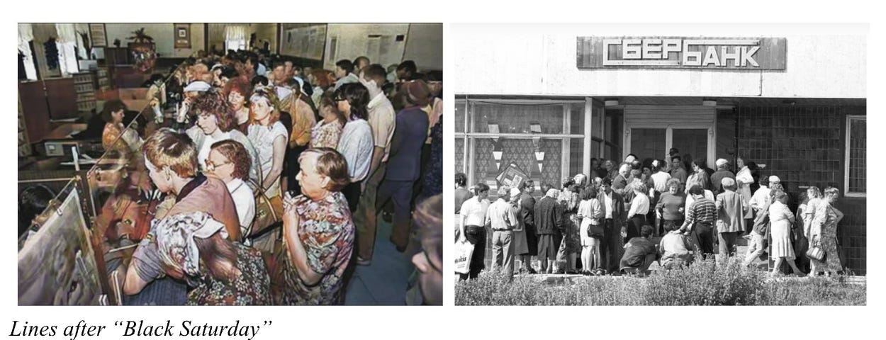 The government of Boris Yeltsin had decreed it was withdrawing all old rubles from circulation. Russians who’d stuffed rubles in mattresses for decades would be wiped out, unless they could fight through huge bank lines to exchange bills. Worse, the maximum amount was 35,000 rubles, or roughly $30-$35, about 60 percent of a Russian’s average monthly salary of 58,700 rubles. Those who exchanged the full 35,000 had passports stamped barring all future exchanges. I’ll never forget seeing a burly woman yelling, to no one in particular: “Vori, blyad!” (“Fucking thieves!”).