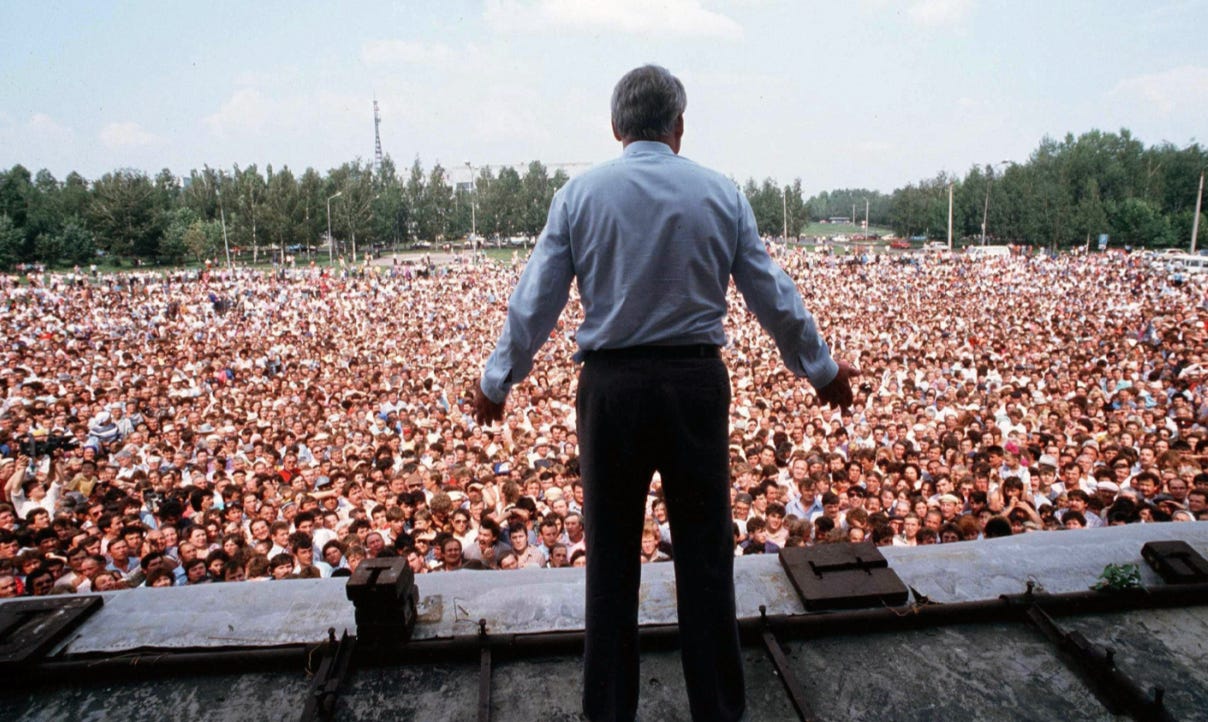 Boris Yeltsin in arctic Vorkuta, 1990. Striking miners helped him bring down the Soviet Union. Eight years later, I watched them go on strike against his government