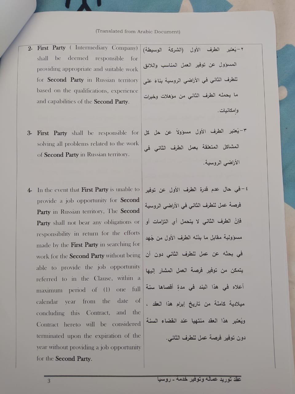 Mohamad said the agreement between the Yemeni recruits and Al Jabri was a monthly salary of $2,500 with a signing bonus of $20,000. A copy of an employment contract written in both Arabic and English obtained by Drop Site lists the Al Jabri General Trading & Investment Co. SPC and Abdul Wali Al Jabri as the company representative. The contract outlines the company’s role in arranging for jobs in Russia “in the military, security, or civil field, based on…qualifications, experience, and capabilities” and says the contract ends after the signee “obtains Russian citizenship.” Mohamad said he was never told that he would be sent to fight for the Russian army in Ukraine and there is no indication in the contract.